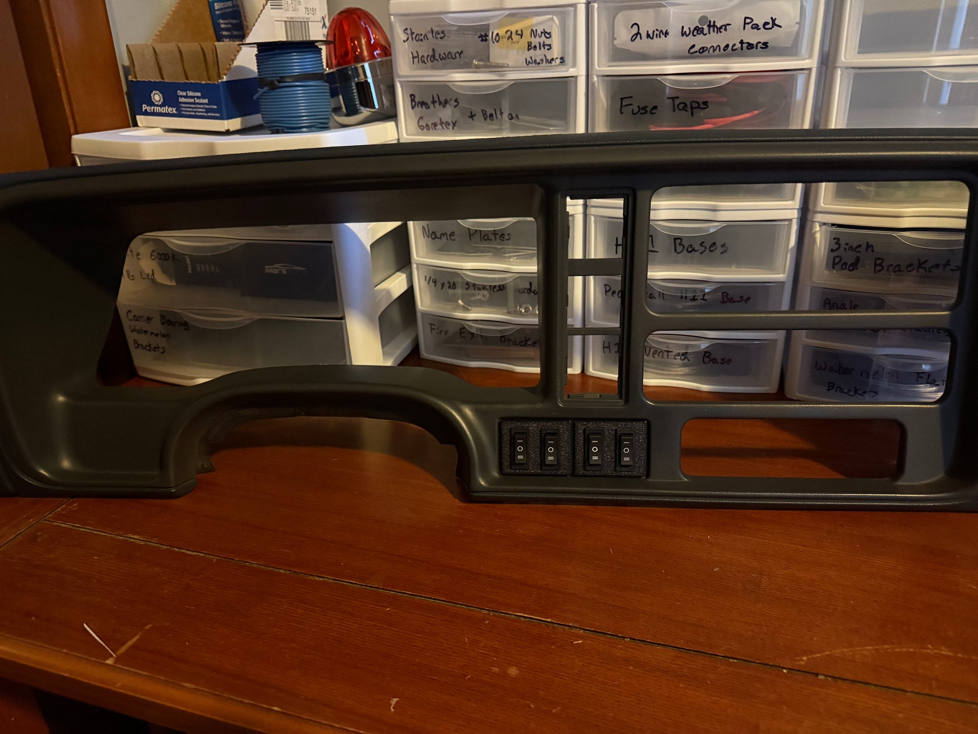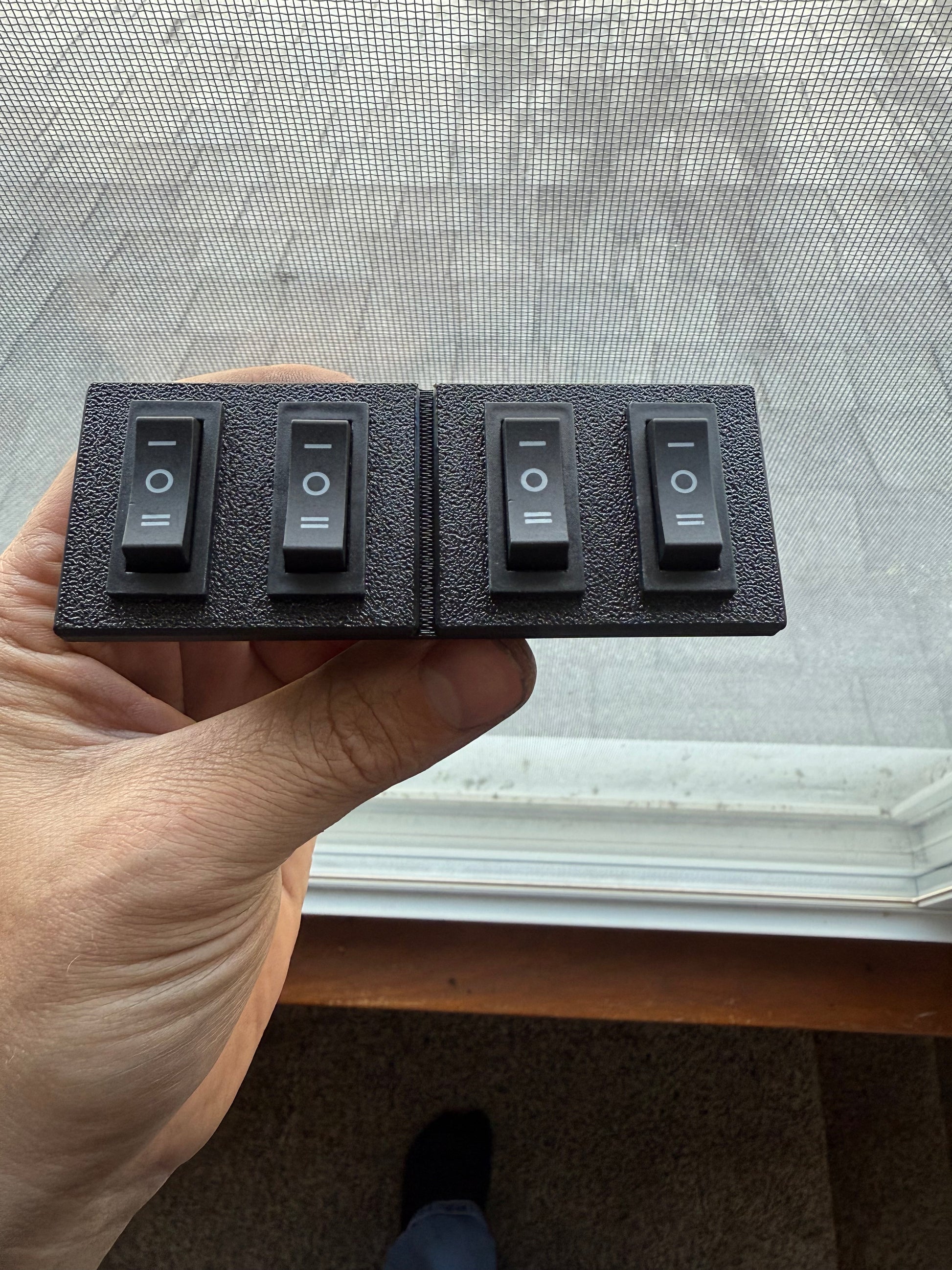 Mounts to factory dash bezel to right of steering wheel. Snaps into factory location, comes with 4 on-off-on rocker switches. Made in the USA with of Polyethylene Terephthalate Glycol for a lifetime of use. The switch panels can be painted or wrapped to match your interior.